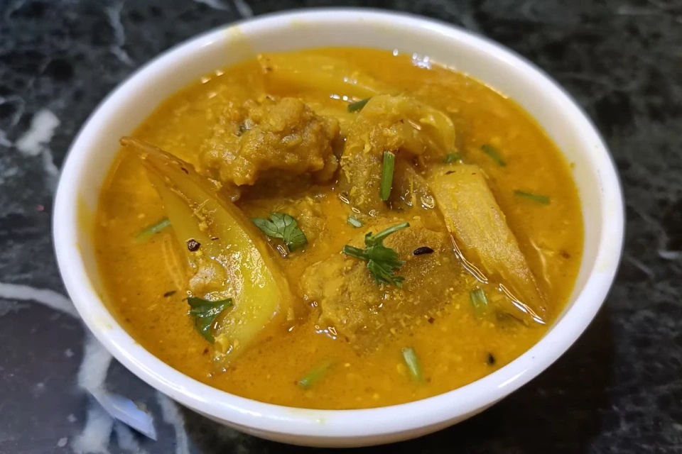A very unique and offbeat item, contrary to Aloo Pitika on the list. Khar (alkaline) is a favourite dish among the natives and an important part of Assam food.