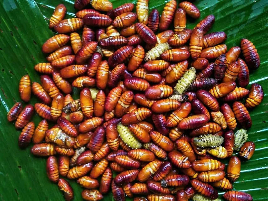 The silk is taken out from the cocoon and the pupa is boiled in water to season with different spices and enjoyed as a snack.
